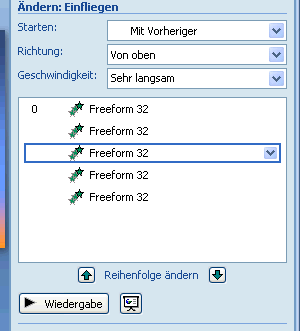 Im Aufgabenbereich sind nun alle Animationen der aktuellen Folie untereinander aufgelistet. Wir können in einer beliebigen Zeile über das Klappmenü die erweiterte Zeitachse einblenden.