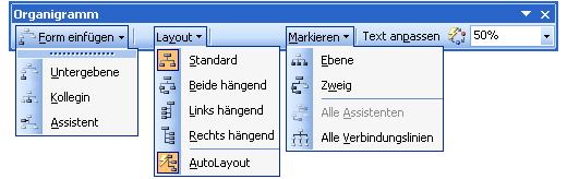 Im Menü Layout der Symbolleiste Organigramm finden wir die Option Auto-Layout. Manchmal kann es hilfreich bzw. notwendig sein, diese Option vorübergehend zu deaktivieren - zum Beispiel, wenn man Elemente vertauschen möchte oder einzelne Formen in der Größe ändern möchte. Dann lassen sich Elemente behandeln wie beim Erstellen von Grafiken mit einzelnen Formen und Linien (siehe Lektion "Grafiken mit Formen und Linien..."). Das Auto-Layout kann danach wieder aktiviert werden (nicht immer gelingt das, ohne das die Formen in die alte Position zurückspringen).